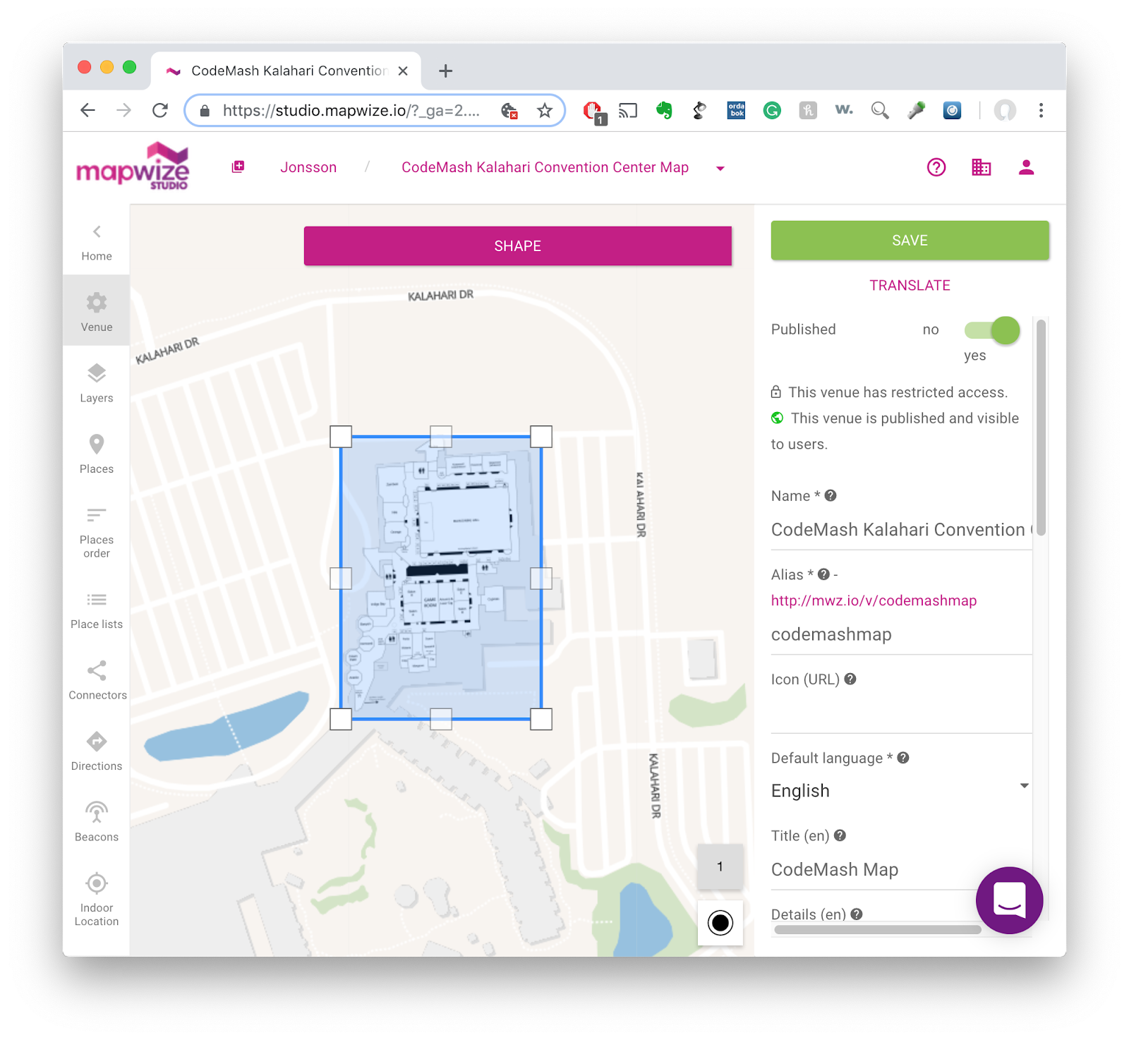 - And that is pretty much it. I then published the map and generated a MapWize URL for it. To make it a bit easier to share and to remember, I created the alias codemash.sjonsson.com.