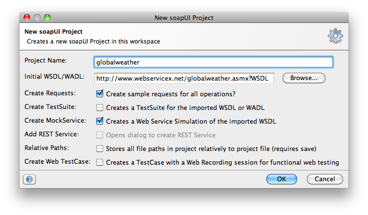 Basically, paste the URL to the web service WSDL file into the Initial WSDL/WADL field and additionally check the field to generate a MockService. SoapUI will now load the Web Service definition and ask you questions about how to create the MockService: